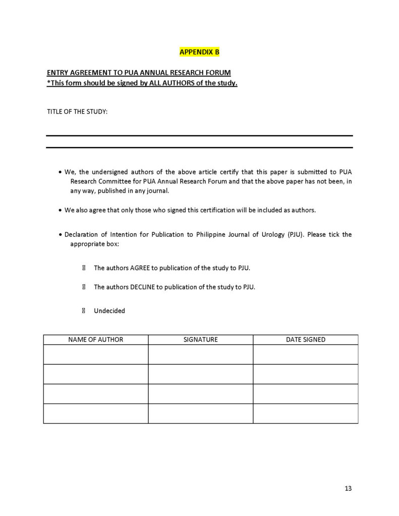 j. If applicable, papers presented in this forum will be encouraged but NOT obliged to be published in the Philippine Journal of Urology. The author/s will have the full discretion as to where he/she wishes to publish the paper.
